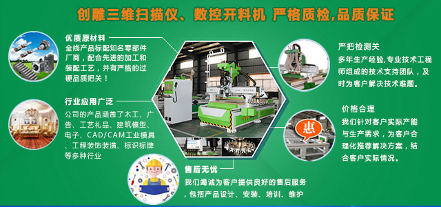 济南创雕三维数控设备有限公司是一家专业从事雕刻机、雕铣机、数控等离子切割机、激光机、四轴联动雕刻机、三维扫描仪、3D打印机等数控设备研发、生产、销售、维修服务为一体的制造企业。主要产品有:木工雕刻机、广告雕刻机、等离子切割机、激光雕刻切割机、石材雕刻机、工艺浮雕机、四轴联动雕刻机、金属模具机、雕铣机、加工中心、激光印章机、三维扫描仪,3D打印机等二十多种型号,满足了不同客户的需求。公司的产品涵盖了木工、广告、工艺礼品、建筑模型、电子、CAD/CAM工业模具、工程装饰装潢、标识标牌等多种行业,形成了冠雕系列产品的多元化优势。<br>作为国内数控设备的专业研制企业,我们竭诚为客户提供良好的售后服务,包括产品设计、产品安装、产品培训、产品维护等;...
