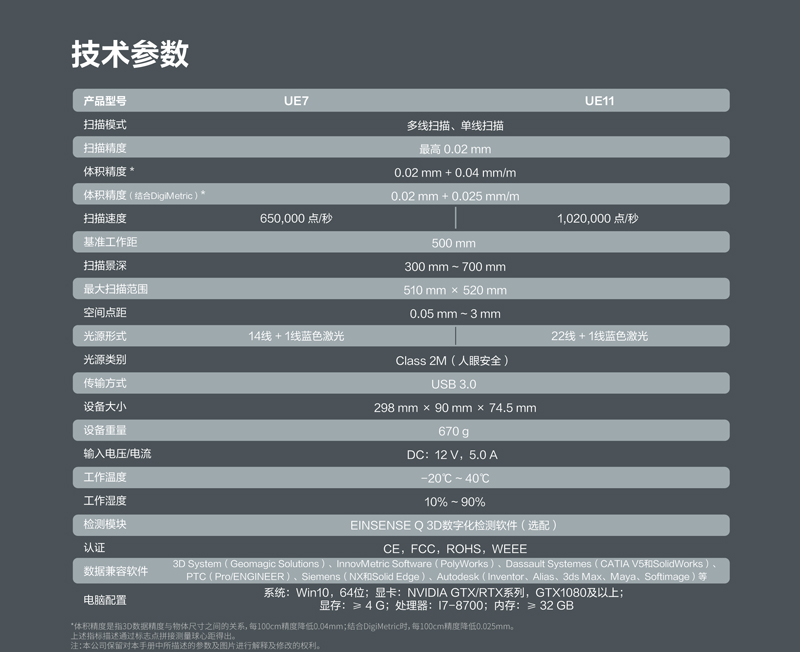 FreeScan UE 7/ UE 11作为FreeScan系列的蓝色激光手持三维扫描仪,继承“高精度”“稳定的重复精度”的标志性特点,同时着力于人体工学与轻量化的设备设计,握持设备操作更轻松,为汽车工业、交通运输、航空航天、模具检测、能源制造及机械制造等行业提供计量级的高精度检测。产品参数