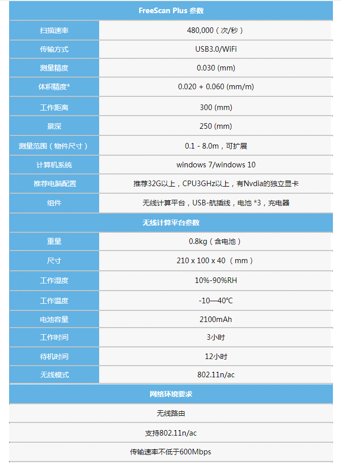 FreeScan Plus是一款真正便携的激光手持三维扫描仪。产品采用先进的无线技术,成功摆脱线缆的束缚。配备智能化AirMaster无线计算平台,成功实现对图像数据的全硬件计算,优化后的产品性能,带来出色的自由扫描体验。 产品参数