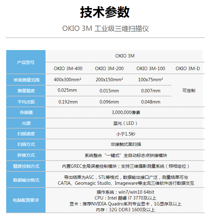 OKIO 3M工业级三维扫描仪,采用先进的蓝光光栅扫描技术,配合300万像素进口工业相机,可满足各种超高精度工业三维测量的需求,为用户提供快捷、有效、可靠的方法来采集物体的三维数据。 产品参数