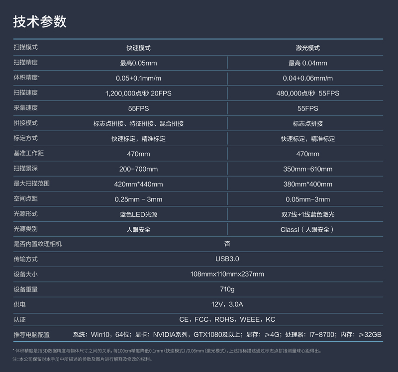 先临三维基于多年三维测量经验,结合市场需求,创新性地将蓝色LED光源与蓝色激光光源集于一款设备,两种光源,兼容多种表面材质和物体尺寸;一机多用,兼顾效率与数据质量,满足用户的多重需求,既有 LED结构光的快速高效,又兼顾激光的精度和细节,赋予EinScan HX更多应用可能。 产品参数