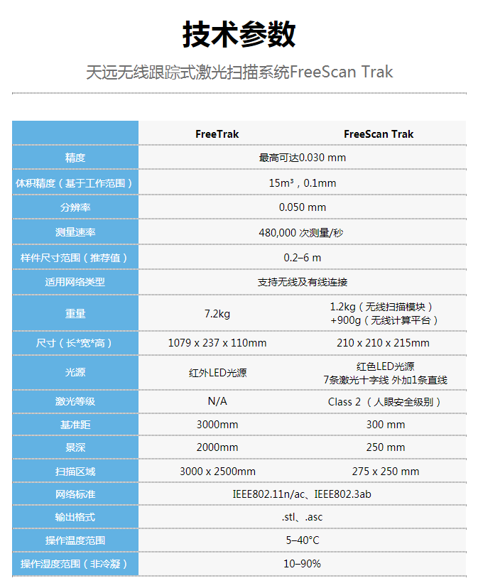 光学跟踪仪能够实时跟踪定位扫描头的空间位置。扫描时无需贴点,让操作人员节省了大量时间,将扫描大中型样件,获取计量级别精度的三维数据过程变得轻松简单。它适用于各类静态和动态应用场景,主要包括航空航天、汽车、造船、能源等行业的大场景三维检测需求。 产品参数
