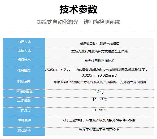 随着大视场光学跟踪定位技术的发展,一种具备自拼接功能的三维扫描技术应运而生,该技术将光学跟踪和三维扫描两项技术融合,一举打破了三维扫描受限标记点拼接的瓶颈,特别在大批量工件自动化快速三维扫描领域,该技术表现出跟踪视野宽阔、人工干预程度低、扫描效率高等优势,所以只要节拍能满足需求,那么此方案无疑是客户的理想选择。 产品参数