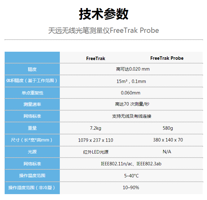 FreeTrak Probe无线光笔测量仪可便携至计量室、车间和各类具有挑战性的工业环境中使用,系统在运行中不易受到振动、位置变化等因素的影响,用户在测量过程中可随时移动光学跟踪仪或光笔,获取稳定的高精度数据。该系统解决了传统坐标测量仪不便携的瓶颈,是提升整体测量效率的理想方案。 产品参数