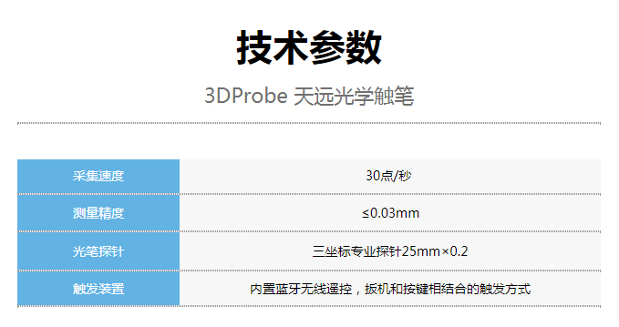 很多复杂的测量应用需要面扫描数据和点测量数据。天远光学触笔就是一个和天远三维扫描仪共同使用的一个模块组件,数据可以与三维扫描仪数据自动整合。基于GREC和标志点全自动拼接技术,天远三维扫描仪测量头可以在视场内识别光笔位置,记录并计算触点坐标进行数据整合。测量头和触笔不需要准确定位以及有任何需要固定的相对位置,而且是无线遥控触发,保证了高稳定性和灵活的测量范围,轻巧的设计可以进行长时间高效的测量。 产品参数