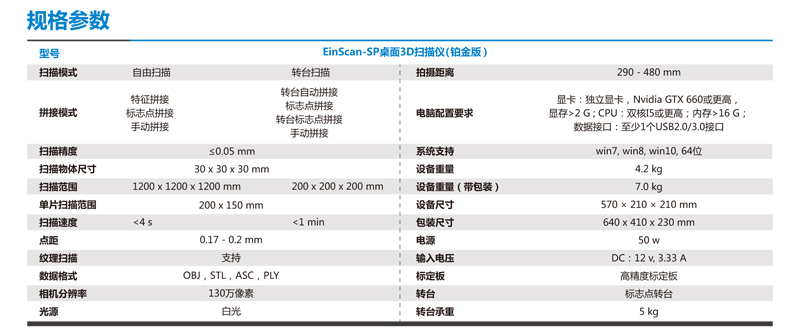 新一代桌面3D扫描仪EinScan-SP更快速的扫描,更高的精度,可实现快速高精度扫描,单幅扫描精度达到0.05mm,满足办公条件下的逆向设计需求。 产品参数
